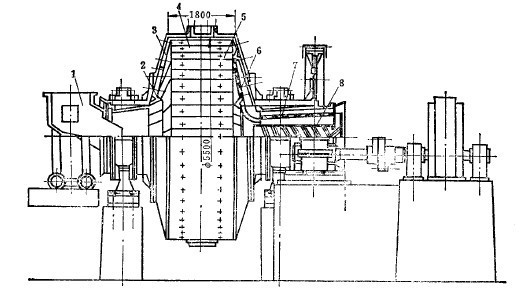 被粉碎的物料在主風機10(主風機的作用是使調節好的空氣流在自磨機和分級機內循環并運輸物料)造成的強大風力作用下被連續排出,沿著管道進入沉降箱6進行第一次分級,較粗的顆粒便沉降下來。細小的物料繼續進入旋風分離器7,進行第二次分級,這時絕大部分細小物料都沉降。已在沉降箱和旋風分離器中沉降的物料靠鎖氣器8間斷排出,貯存在粉礦倉9中,以便進行干式磁選。
