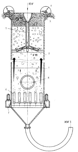 2)尾礦管堵塞。這是操作中容易發生的故障。原因多是由于礦漿中的礦石粒度太大,或者因給礦量突然增大和尾礦管閘門開的太小以及柱中落入其它雜物。排除方法:應事先在排礦管下端的適當位置安裝高壓水管或高壓風管,一旦發生堵塞,可用高壓水或壓縮空氣來疏通。并檢查粒度與給礦量,至調到正常為止。