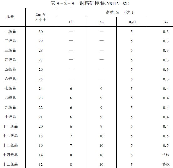 送往冶煉廠的銅精礦,由于礦石產(chǎn)地,礦石種類和銅選礦技術(shù)條件的不同,其化學(xué)成分和礦物組成是極其復(fù)雜的。冶煉廣對這些化學(xué)成分和礦物組成不作具體規(guī)定,僅根據(jù)冶煉方法,冶煉工藝特點及冶煉技術(shù)的不同,對某些成分加以適當限制。但出于冶煉對精料的要求,以及對選冶聯(lián)合成本的考慮,對入廠精礦的含銅品位規(guī)定了十五個等級(表9-2-9)。